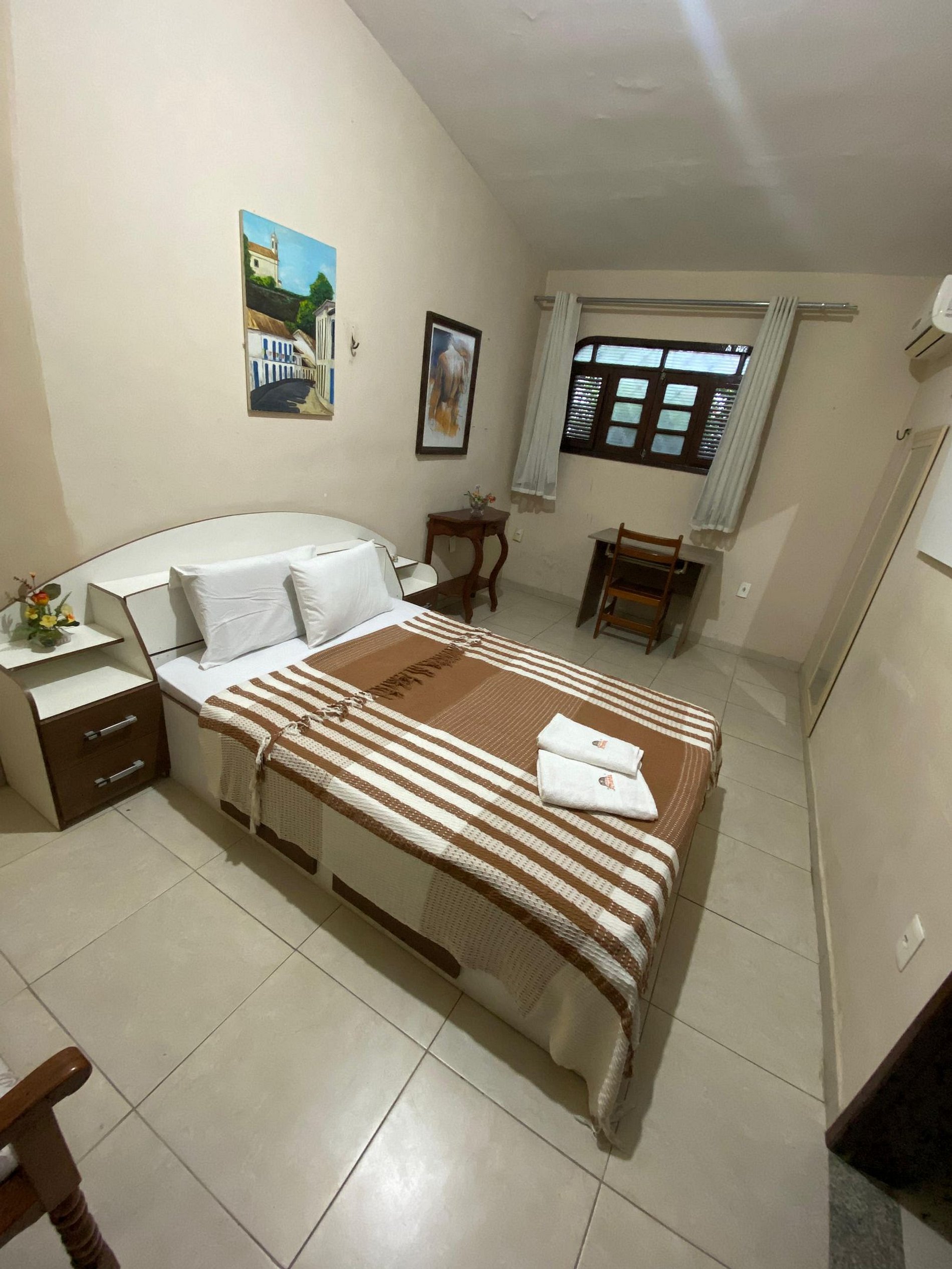 Cada um dos cinco quartos foi projetado para oferecer conforto e praticidade. Desde a cama de solteiro com móvel de apoio e closet até o quarto principal com cama de casal, ar condicionado e banheiro privativo, cada detalhe contribui para uma experiência de estadia excepcional. A presença de ventiladores e um ar condicionado em vários quartos garante um ambiente sempre agradável, independentemente da estação.