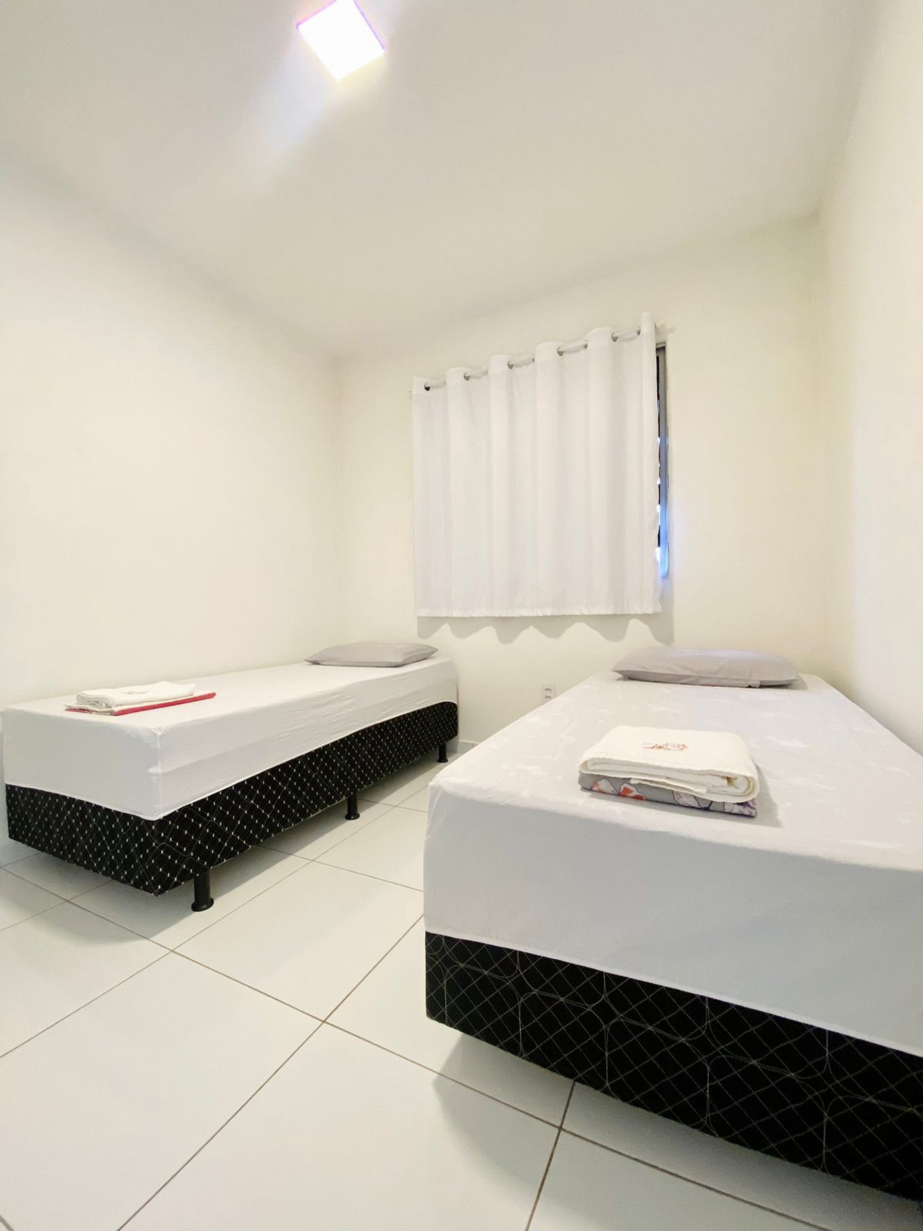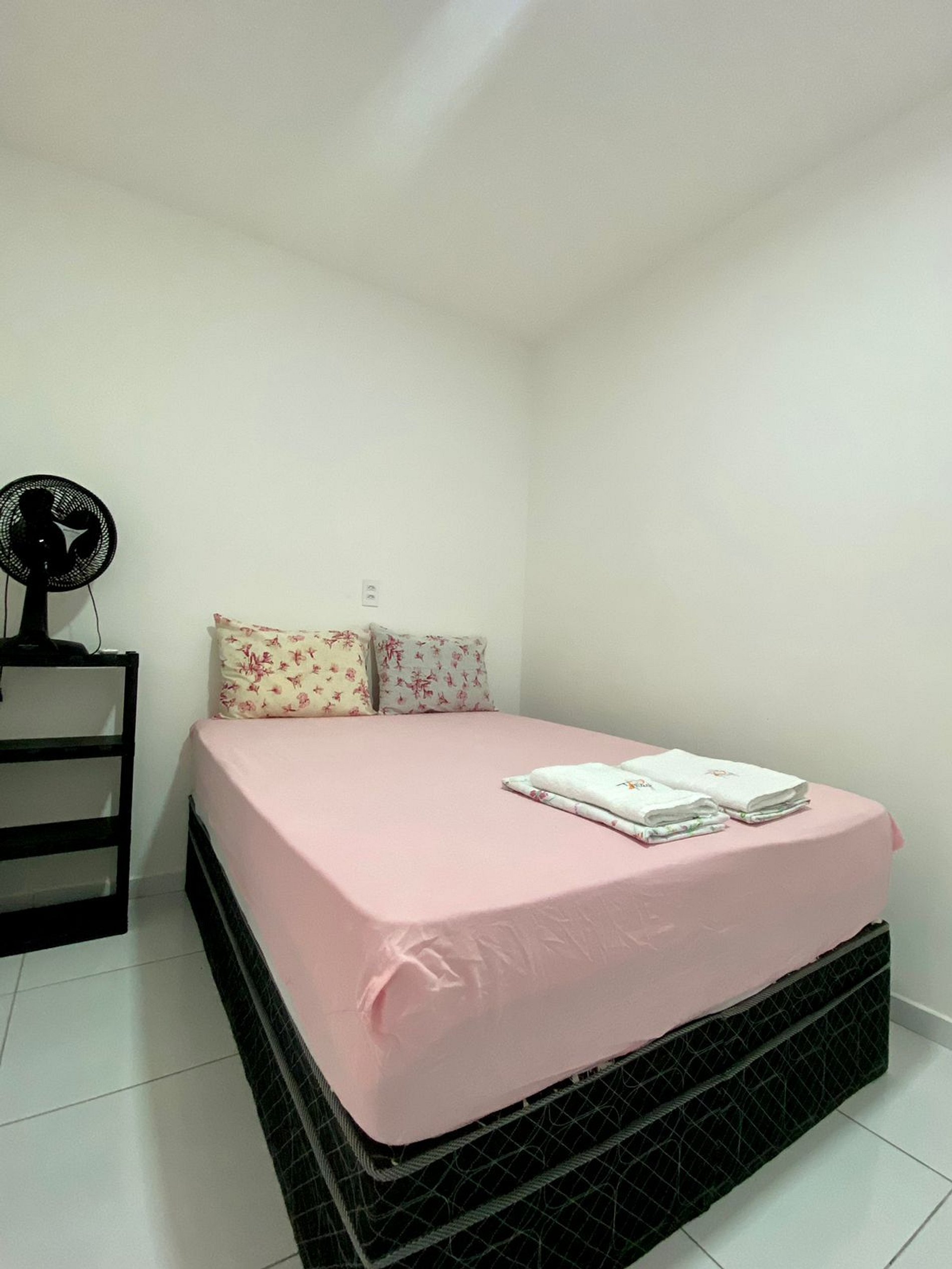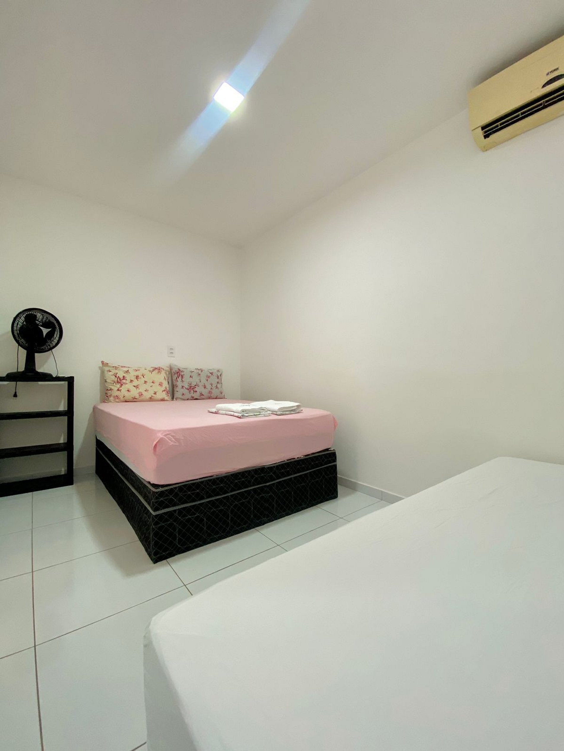 Dois quartos: O quarto triplo, com cama de casal e cama de solteiro, possui ar-condicionado, garantindo noites frescas e confortáveis. O quarto duplo, com duas camas de solteiro, conta com ventilador, oferecendo um clima leve e agradável.
