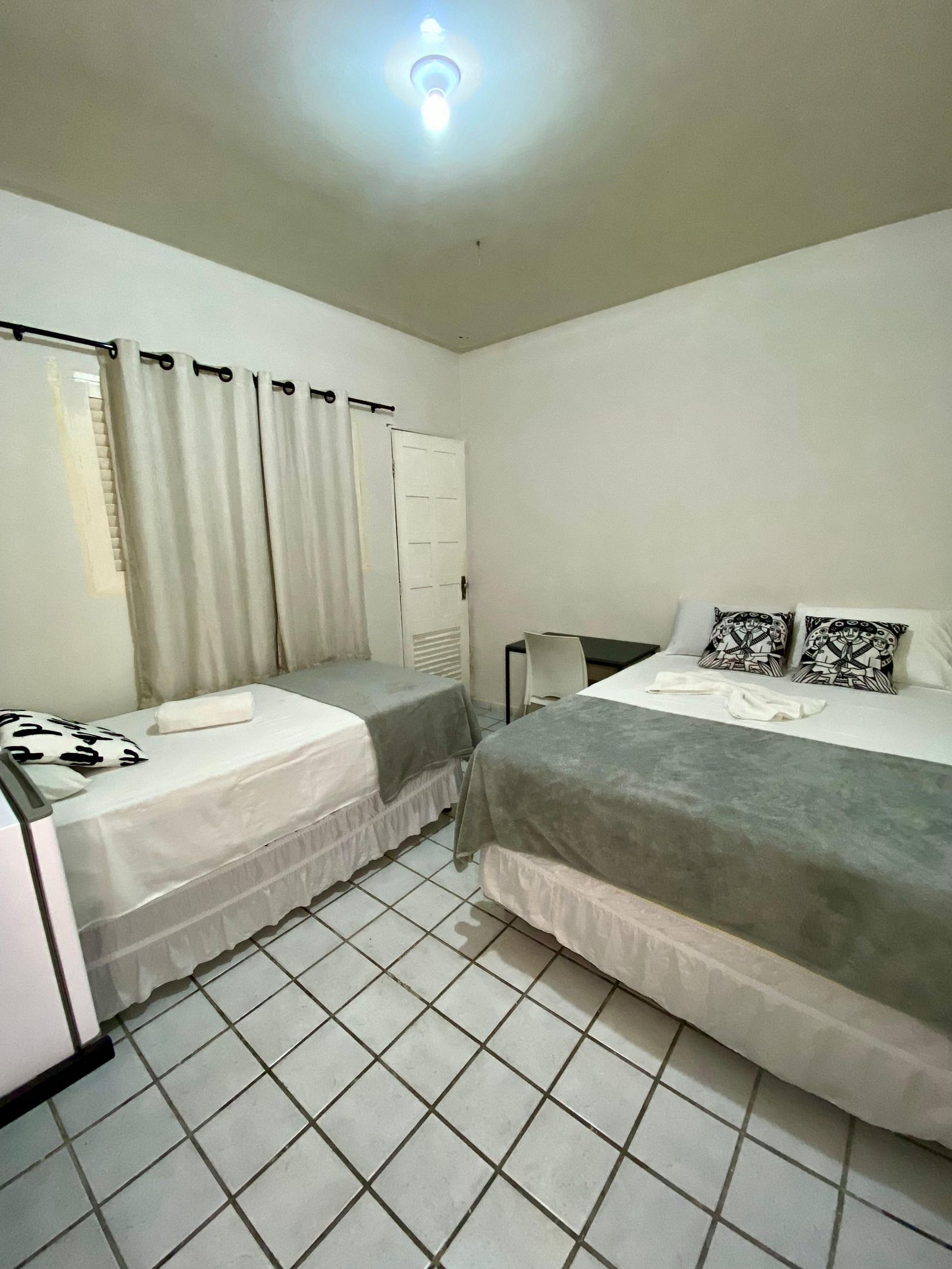 O quarto é amplo e bem organizado, oferecendo excelente circulação e comodidade. Conta com cama de casal, cama de solteiro, ar-condicionado, Wi-Fi, frigobar e banheiro privativo, proporcionando tudo o que o hóspede precisa para uma experiência confortável.