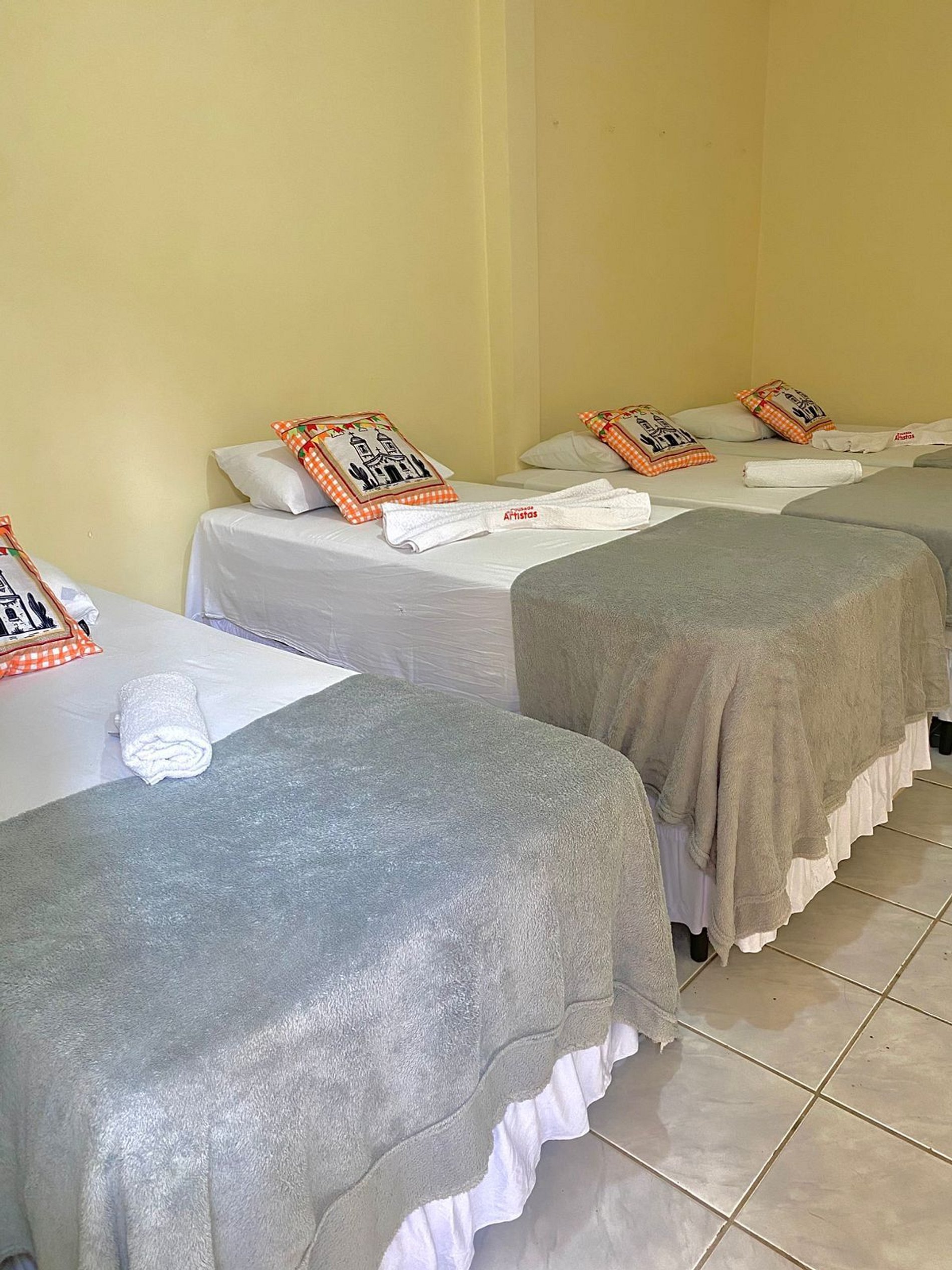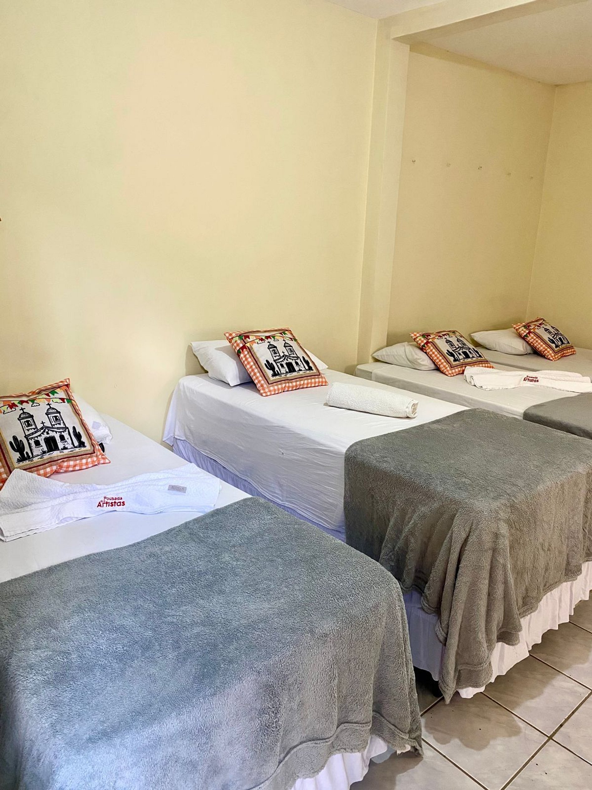 O quarto é espaçoso, com boa circulação e conta com quatro camas de solteiro, ar-condicionado, Wi-Fi, frigobar e banheiro privativo.