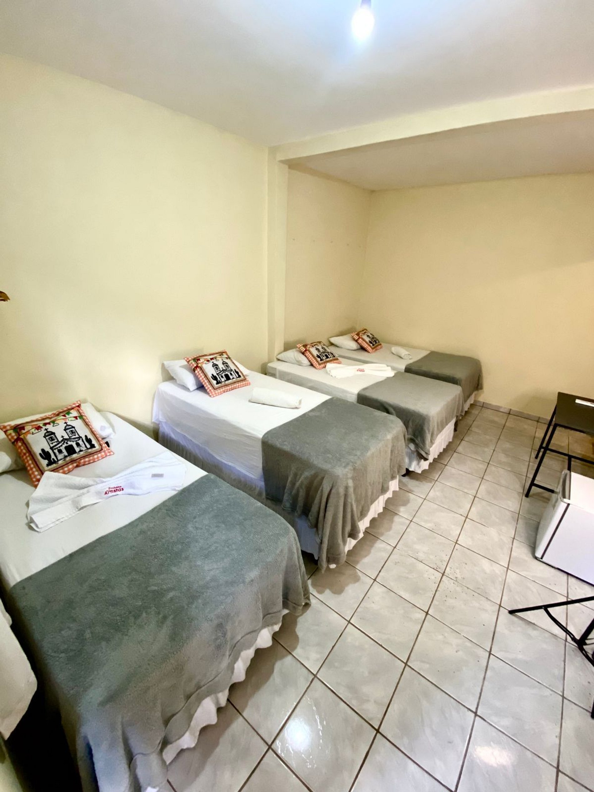 O quarto é espaçoso, com boa circulação e conta com quatro camas de solteiro, ar-condicionado, Wi-Fi, frigobar e banheiro privativo.
