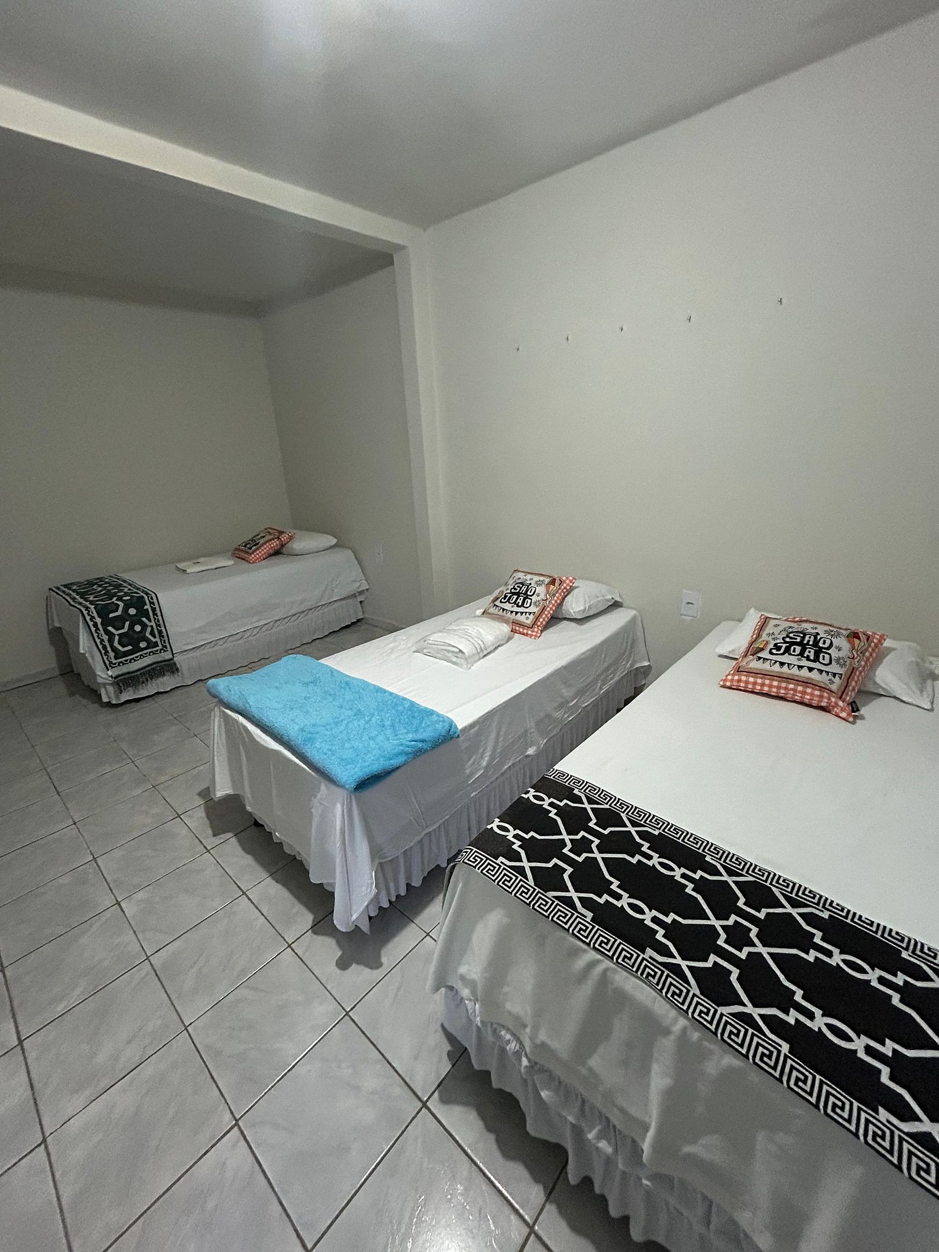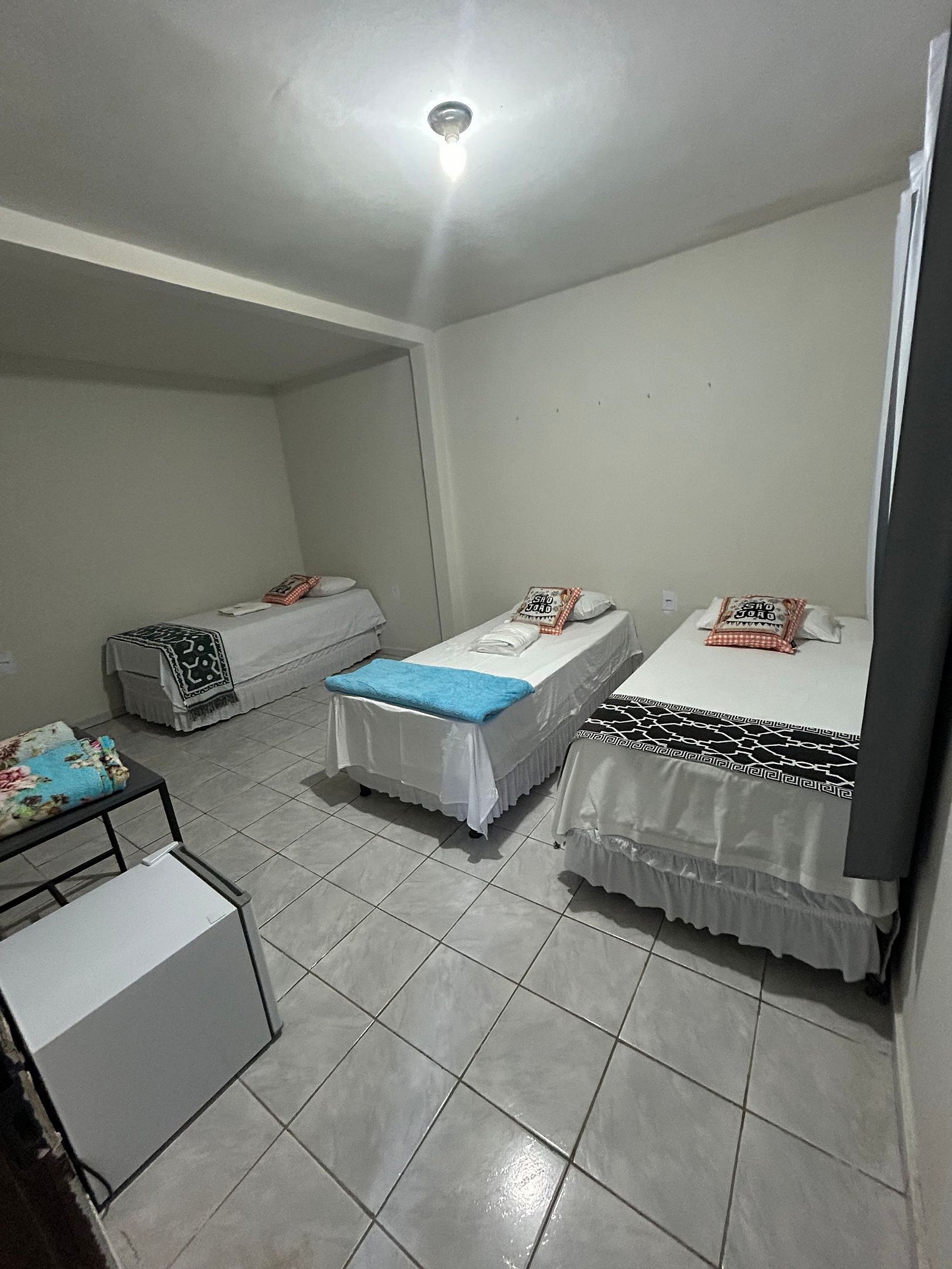 O quarto apresenta uma área espaçosa, com disposição que favorece a circulação e o conforto do hóspede. Contando com três camas de solteiro, Ar condicionado, Wi-fi, Frigobar e Banheiro Privativo